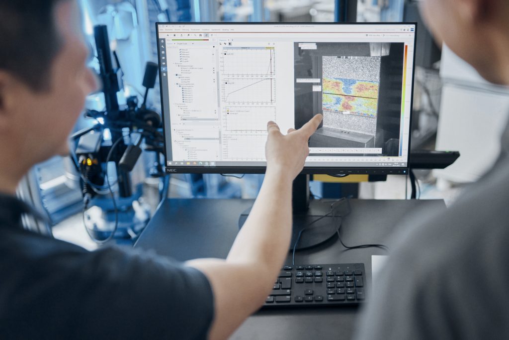 Das System basiert auf digitaler Bildkorrelation (DIC) und Point-Tracking zur Analyse von Dehnung, Verformung und Bewegung.